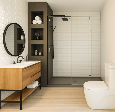 A casa de banho foi totalmente redesenhada, apostando na simplicidade elegante do branco e preto, com linhas minimalistas, soluções de arrumação integradas e um duche amplo em vidro que amplia a perceção do espaço.