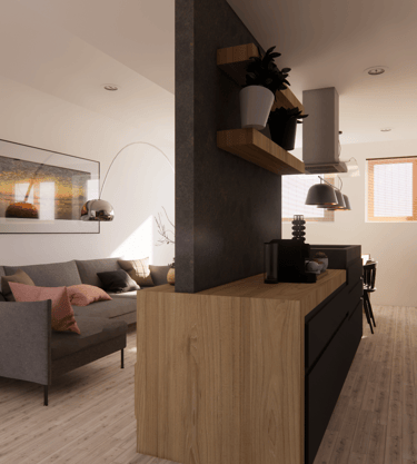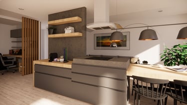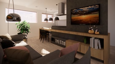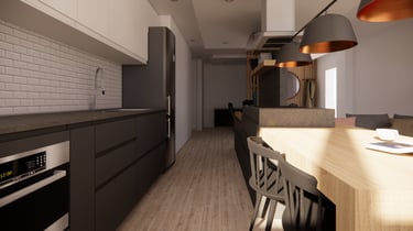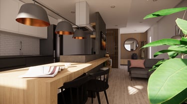 A sala e a cozinha foram integradas num espaço aberto, permitindo a circulação em volta do bloco central que organiza os ambientes e cria ligação entre estar, jantar e cozinhar. A madeira clara, em contraste com os tons escuros dos móveis e revestimentos, reforça a sensação de amplitude e modernidade, enquanto a iluminação pontual valoriza as zonas de convívio.
